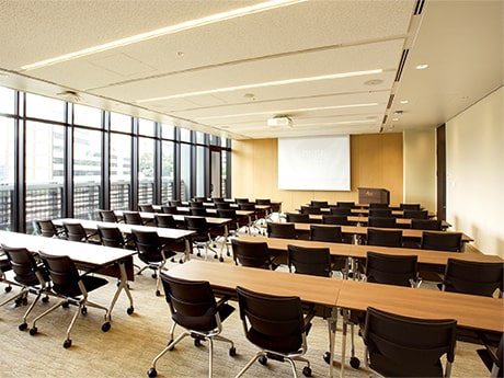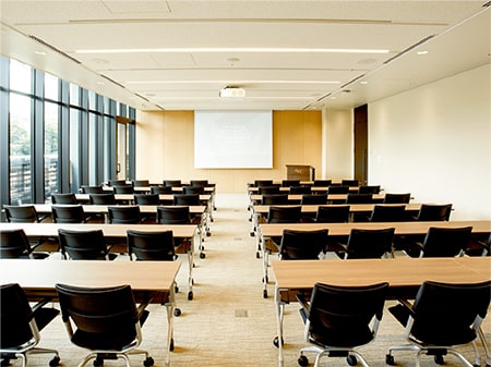 A spacious room with a 3 m high ceiling and a view of the vegetation on the facility grounds. Not only can this room be used for 50-person seminars and training sessions, but also as a waiting room for participants in international conferences and symposia. There is a Kiosk where guests can enjoy drinks and snacks, and there are roomy conference chairs that are comfortable for long periods of use. This room's environment ensures that people can maintain their concentration even in long meetings and training sessions.