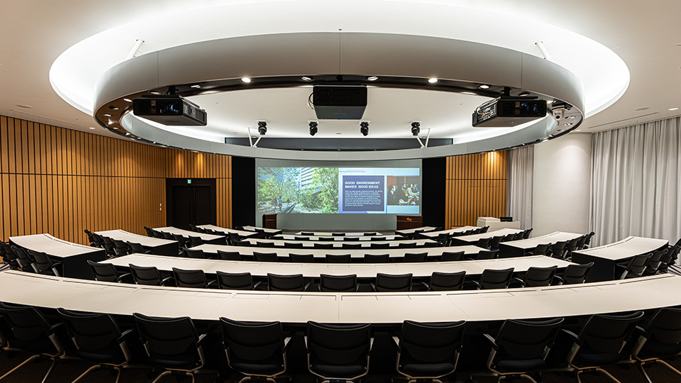 This conference room has a fan-shaped design with spacious personal space. The amphitheater-style multilevel design of this room makes it easy to see presentations from every seat in the room. In addition to the standard screen, there are also two glass screens that can be projected onto, so the room can be used for various presentations with rich visuals.