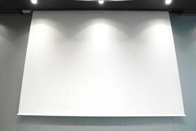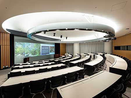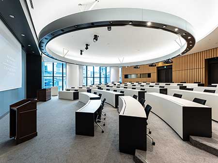 This conference room has a fan-shaped design with spacious personal space. The amphitheater-style multilevel design of this room makes it easy to see presentations from every seat in the room. In addition to the standard screen, there are also two glass screens that can be projected onto, so the room can be used for various presentations with rich visuals.