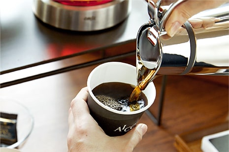 In addition to hot coffee, iced green tea and iced rooibos tea are also available. The coffee servers and fixtures were selected with particular attention to their design aesthetics, creating a refined atmosphere.