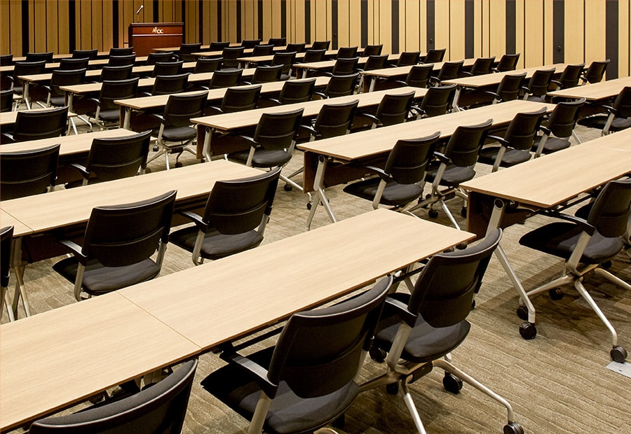 When taking part in long seminars or meetings with a classroom layout, allocating three chairs per table can result in the middle chairs not being used, or in participants sitting in middle seats feeling crowded in by the people to their right and left. That's why AICC offers two-person tables. Our chairs are spacious and have armrests, making them comfortable and preventing participants from becoming restless.