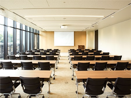 天井高3m、敷地内の豊かなグリーンを望む、開放感のあるスペース。50名規模のセミナー・研修などのご利用はもちろん、国際会議やシンポジウム時には関係者の控室としても最適です。また、飲み物とスナックが楽しめるKIOSK、座面が大きく疲れにくいコンファレンスチェアもご用意。長時間の会議や研修にも、集中して取り組める環境を整えました。