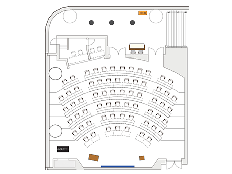 どこからでもプレゼンテーションが見やすい階段状のつくりと、ゆとりあるパーソナルスペースが特長の扇型の会議室です。通常のスクリーンに加えて映像を2面投影できるガラススクリーンを備え、ビジュアルを駆使したさまざまなプレゼンテーションが行なえます。