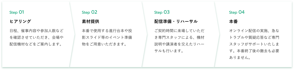 配信拠点が複数あるオンライン配信・講演会にオススメのプランです。会場側でヒアリングし機材一式、オペレーターを手配いたします。配信業者への直接のご連絡は一切不要。