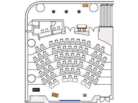 This conference room has a fan-shaped design with spacious personal space. The amphitheater-style multilevel design of this room makes it easy to see presentations from every seat in the room. In addition to the standard screen, there are also two glass screens that can be projected onto, so the room can be used for various presentations with rich visuals.