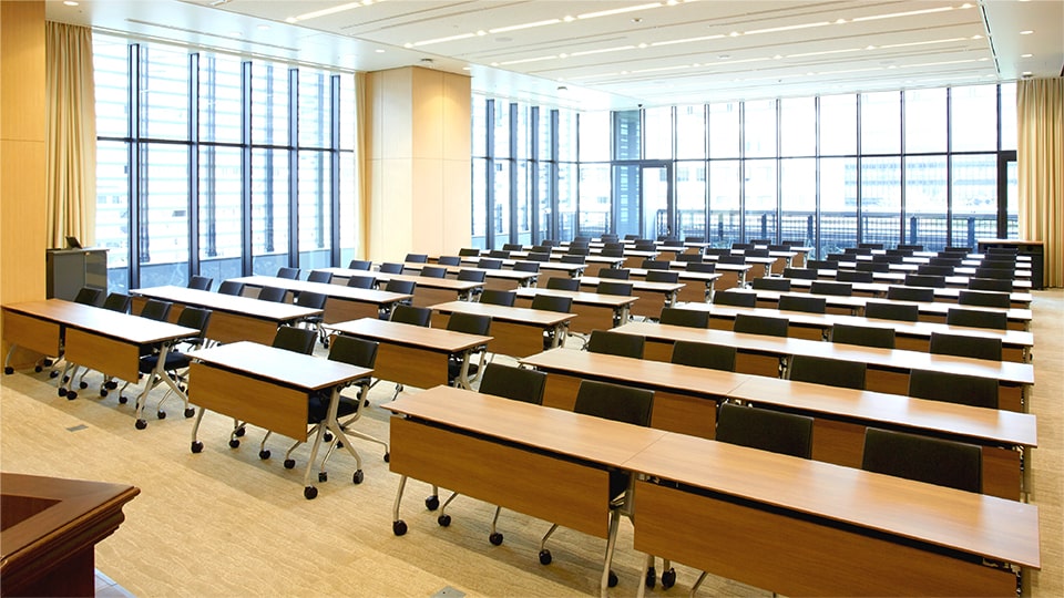 天井高4m、2面あるガラス面から敷地内の豊かなグリーンが見渡せる開放感のある「301」。ステージや専用受付など無料の付帯備品も多く、セミナーに必要なものを完備しています。音響・照明・映像は専用タッチパネルで操作でき、参加者の集中力も途切れません。