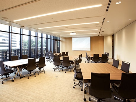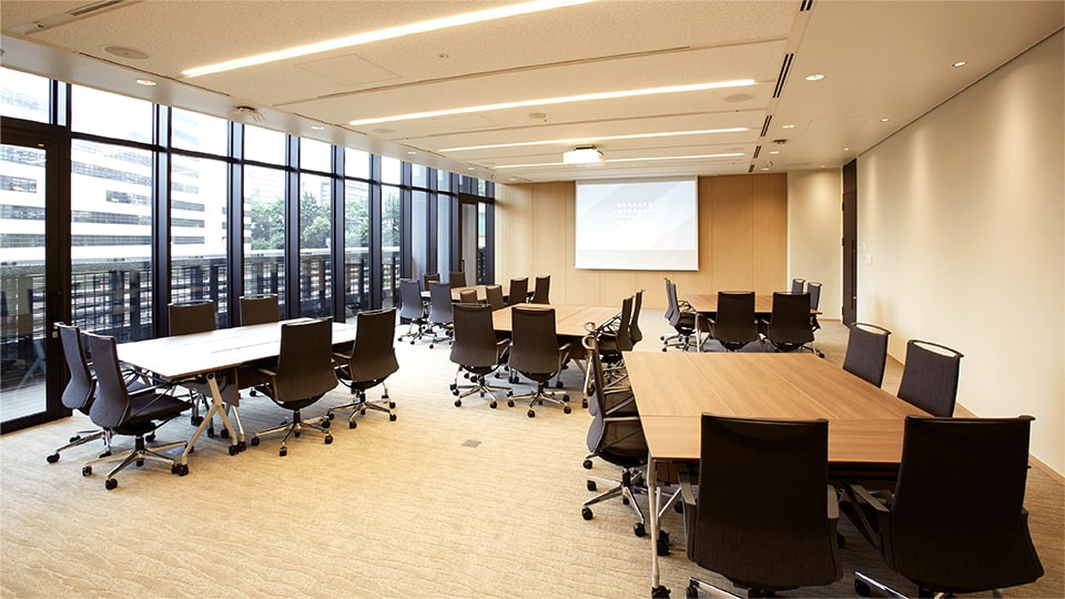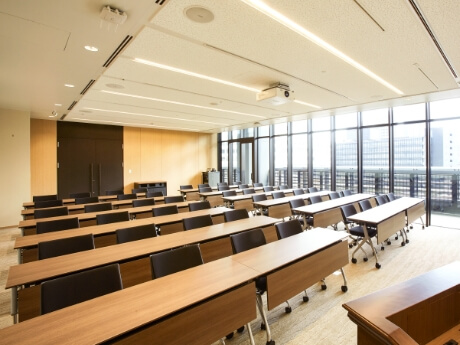 天井高3m、敷地内の豊かなグリーンを望む、開放感のあるスペース。50名規模のセミナー・研修などのご利用はもちろん、国際会議やシンポジウム時には関係者の控室としても最適です。また、飲み物とスナックが楽しめるKIOSK、座面が大きく疲れにくいコンファレンスチェアもご用意。長時間の会議や研修にも、集中して取り組める環境を整えました。