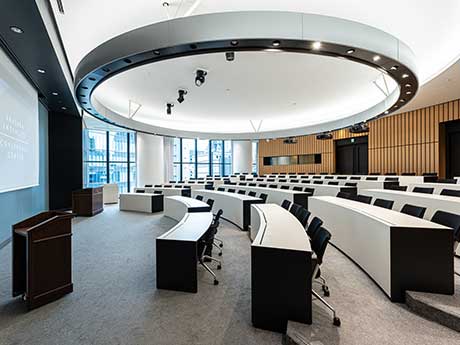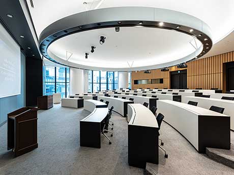 どこからでもプレゼンテーションが見やすい階段状のつくりと、ゆとりあるパーソナルスペースが特長の扇型の会議室です。通常のスクリーンに加えて映像を2面投影できるガラススクリーンを備え、ビジュアルを駆使したさまざまなプレゼンテーションが行なえます。